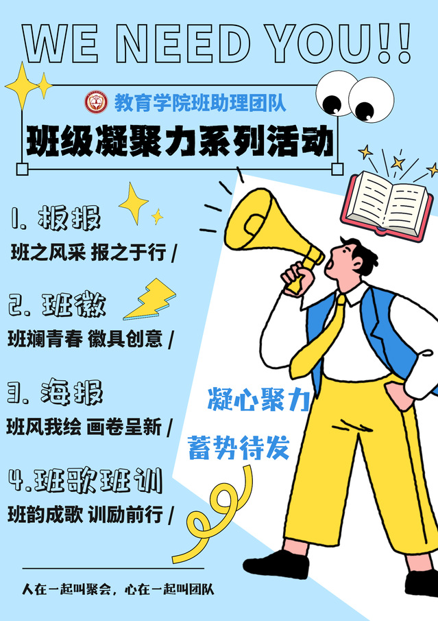为增强2025级新生班级团队精神,教育学院班助理团队将开展“班级凝聚力”系列活动。通过设计板报、班徽、海报、班歌与班训,促进新生们在合作中增强团结精神,塑造积极向上的班级风貌。