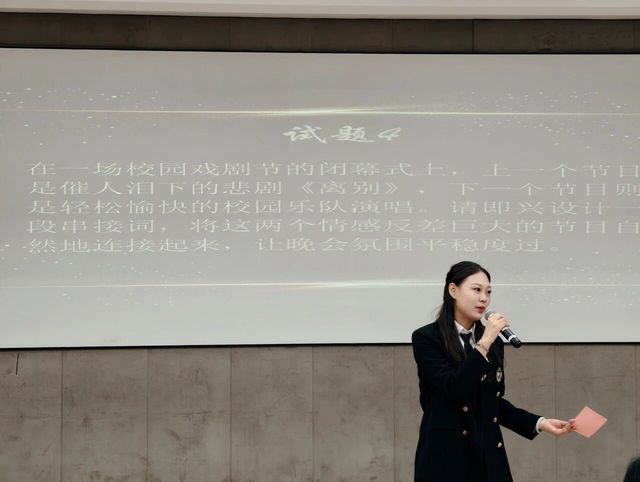 第一轮得分统计完毕后,选手们根据排名顺序依次上台随机抽取即兴题目。面对挑战,他们沉着冷静,在短短六分钟内迅速构思。随后的即兴主持环节,选手们从妙语连珠的开场,到引人入胜的临场发挥,每一个环节都展现出高水平的主持天赋和专业综合素养,瞬间将全场气氛推向最高潮。