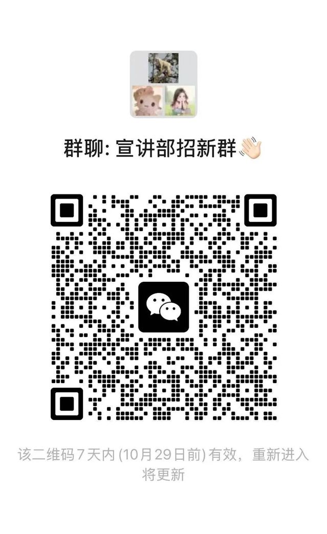 报名通道已开启,记住哦——只有扫码加入招新微信群这一种方式!二维码7天内有效,手慢可就错过和我们一起发声的机会啦~