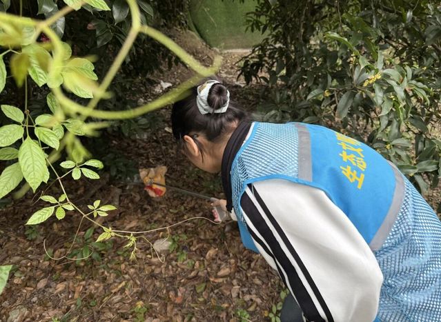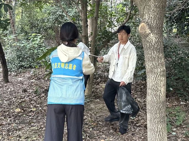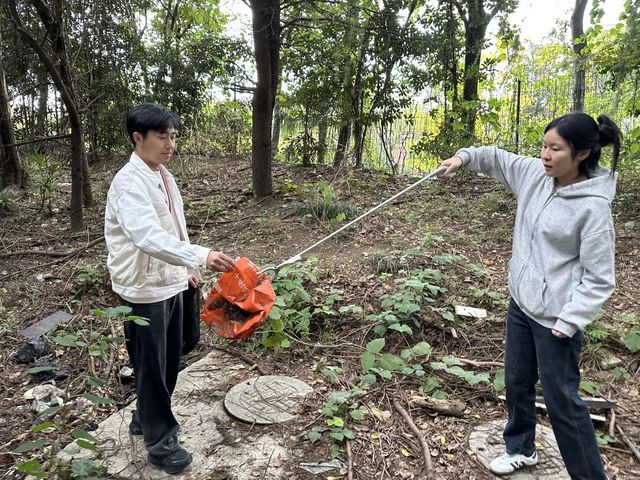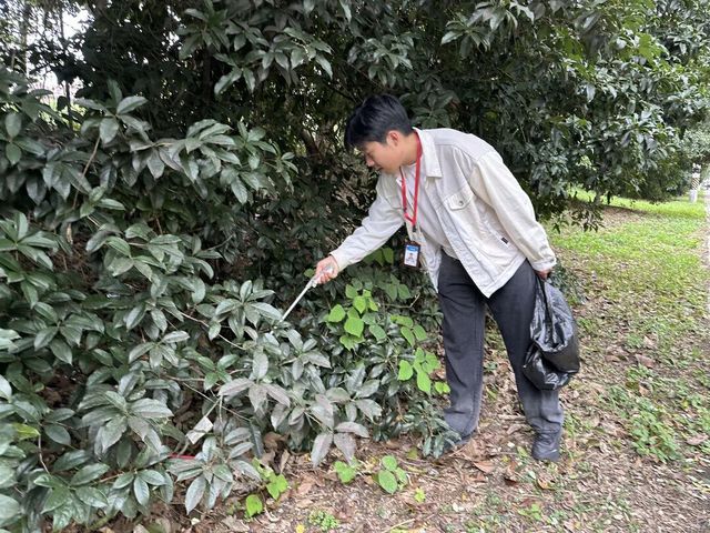 志愿者们相互配合,用垃圾钳仔细拾取灌木根部的烟头与纸屑,小心取下挂在枝杈上的塑料袋,及时将垃圾装入垃圾袋,全程避免二次污染。