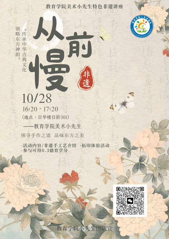 当指尖的温度唤醒沉睡的技艺,当传统的智慧碰撞现代的创意,非遗文化便有了绵延不绝的生命力。10月28日“看见非遗”主题讲座,让我们共赴一场与非遗的约会,相信你定能在其中有所收获,让我们在匠心传承中感受东方美学的独特魅力,共同为传统文化的传播与发展注入新的活力!
