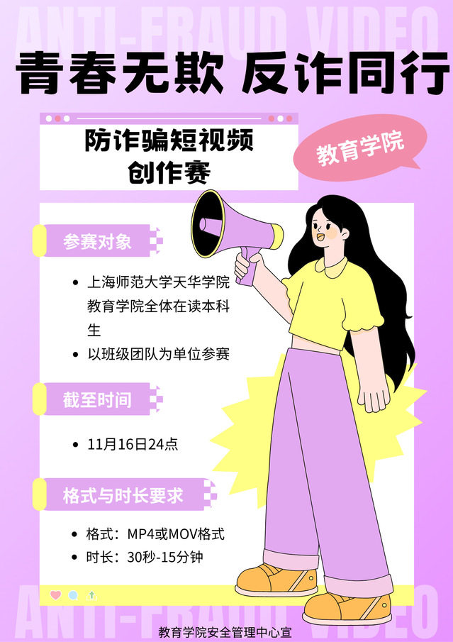 当前高校校园诈骗案件高发,刷单返利、虚假兼职、校园贷、教师资格证“保过” 诈骗、新生群虚假缴费诱导等骗局,正精准瞄准大学生群体。这不仅会造成财产损失,更易引发心理焦虑,破坏校园安全稳定。为打破传统“宣讲式”安全教育局限,将反诈知识转化为更易接受、更具传播力的创意内容,教育学院安全管理中心特发起 “青春无欺,反诈同行——教育学院防诈骗短视频创作赛”,邀你以班级团队为单位,用镜头揭穿骗局,用协作筑牢安全防线!