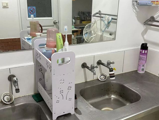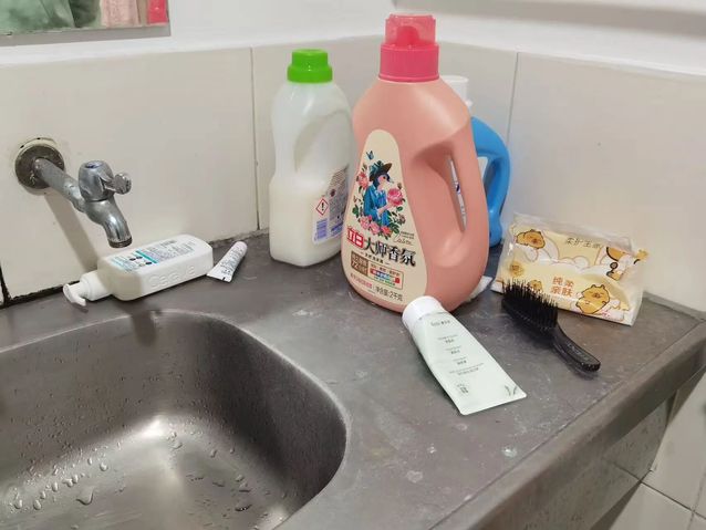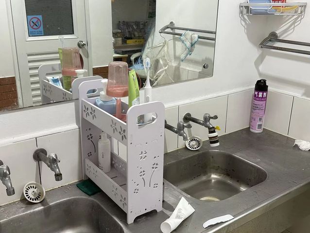 本次寝室结对工作中,我对8-319寝室公共区域开展卫生检查与帮扶。该寝室整体整洁,但存在细节短板:公用饮水机表面及接水槽有水垢水渍,台盆下方堆放各类物品、杂乱且有卫生死角。