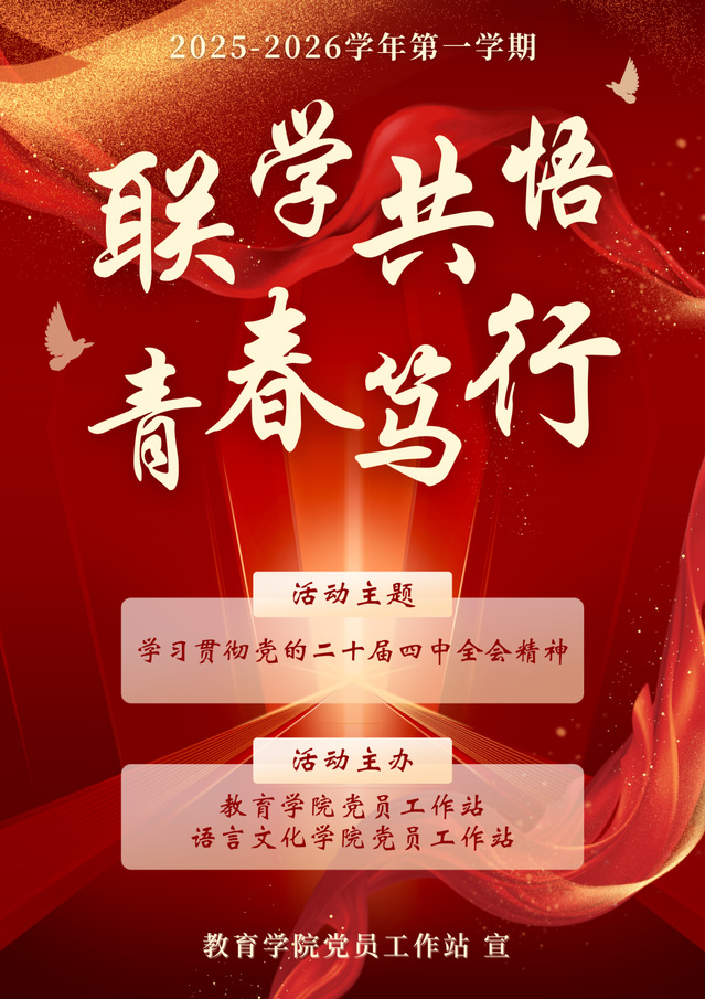 党的二十大的精神,关乎国家的未来,也紧密关系到我们每个人的成长路径。为深入学习贯彻党的二十大精神,教育学院党员工作站与语言文化学院党员工作站于2025年10月30日共同组织开展本次专题学习活动。此次活动以跨院联学的方式,推动宏大主题贴近现实、深入人心,帮助同学们在学思践悟中读懂时代、明确方向,走好属于我们的青春之路。