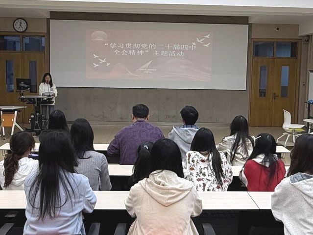活动第一阶段于16:30在日阶103教室开展,主持人通过“视频+讲解”相结合的方式,系统阐释了党的二十届四中全会的核心思想、历史方位与战略任务,帮助同学们深入理解全会精神的核心要义。