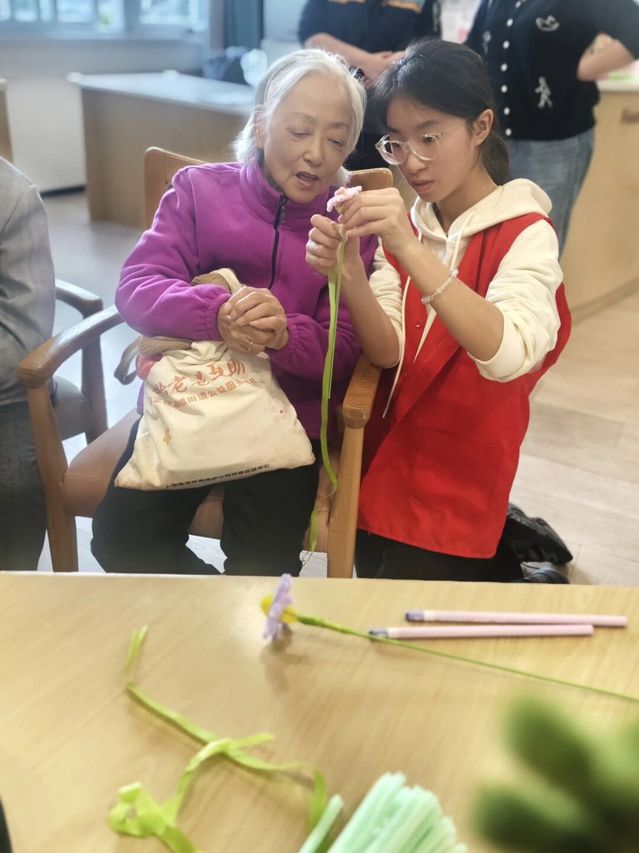 活动现场,志愿者们组织“摸摸乐”猜物活动,长辈们佩戴眼罩触摸纸箱内的蔬菜水果,猜中即获奖,现场欢笑不断。随后,志愿者分发手工材料,手把手教长辈制作扭扭棒花束,手工结束后,志愿者集体演唱红色经典歌曲,悠扬歌声温暖了在场每位长辈的心。