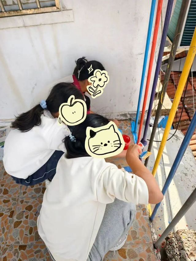 在小屋改造活动中,志愿者与小朋友们一同动手,对“宝藏小屋”的门、墙面及栏杆进行创意改造,共同打造温馨又富创意的小屋空间。