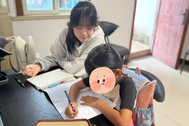 在课业辅导活动中,四位志愿者针对小朋友们的学业薄弱环节,进行一对一的指导,助力他们提升学习能力。