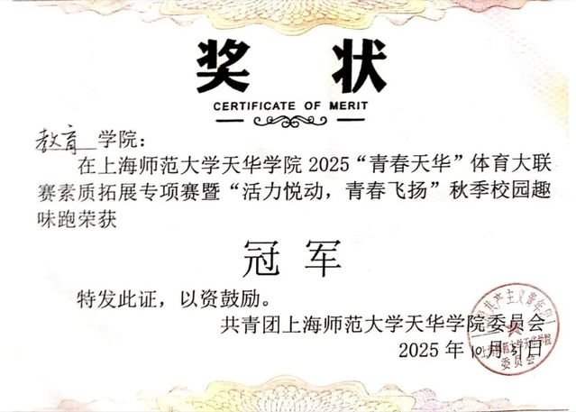 2025年10月31日下午14:30,“青春天华”体育大联赛素质拓展专项赛暨“活力悦动,青春飞扬”秋季校园趣味跑在体育馆落幕。教育学院队以默契的配合、坚韧的意志和永不言弃的精神勇夺冠军,为学院赢得了荣誉!