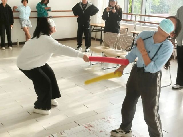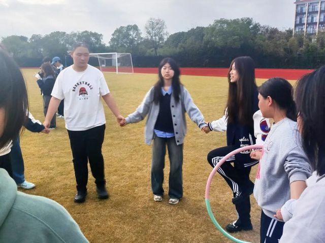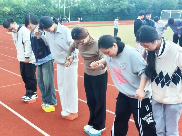赛场上,教育学院的队员们展现出了高超的技术水平和闪亮的体育精神。面对强劲对手,他们毫无惧色,彼此信任,在每一个项目中都留下了精彩瞬间:“盲人剑客”中,沉着判断、果断出击,每一次“击剑”都精准有力;“一圈到底”中,手手相连、灵活穿梭,协作流畅如行云流水;“齐心协力摆造型”中,默契配合、动作流畅,用身体拼出创意与团结的图案;“摸石头过河”中,步步为营、节奏稳健,在协作中快速向前;“三词造句”中,反应迅捷、妙语连珠,用智慧点燃全场气氛。