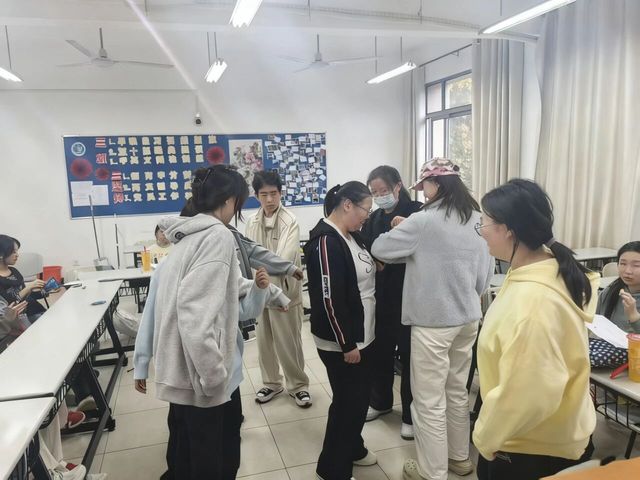 大家围成一个大圈,随着节奏绕圈走。在“口香糖”“粘哪里?”“粘肩膀!”的口令下,大家迅速找到伙伴紧紧相贴,初见的拘谨与陌生感已悄然消散,取而代之的是迅速升温的友谊。这个游戏不仅拉近了彼此间的距离,更在一次次“紧急粘合”中粘住了彼此的笑声与默契。