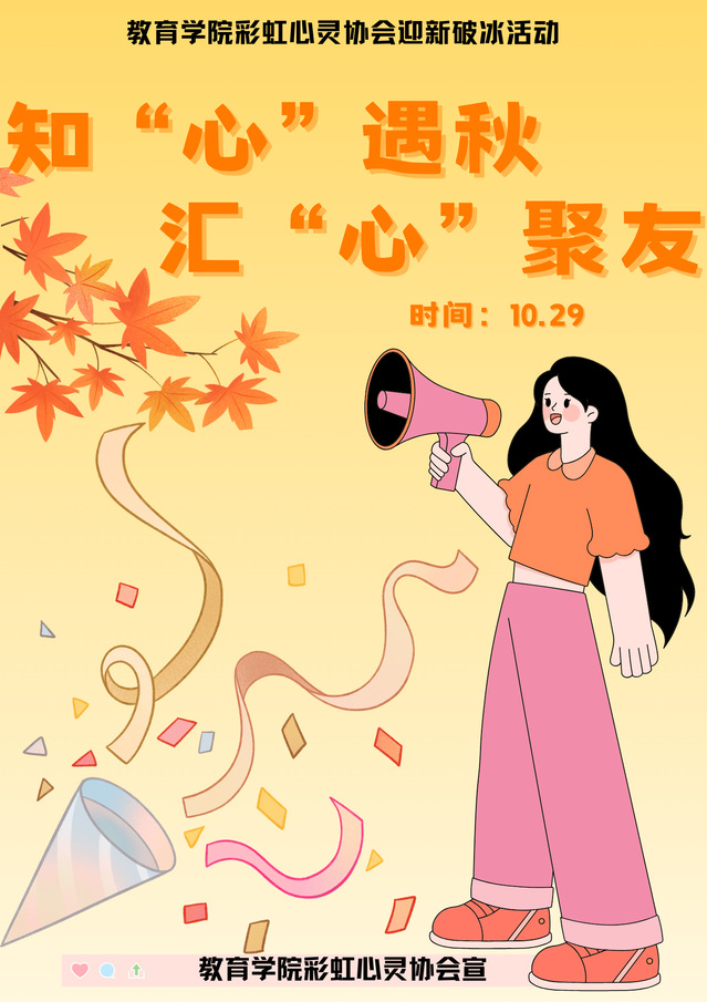在秋意渐浓的美好时节里,教育学院彩虹心灵协会迎来了充满活力的新成员。怀揣着温暖与期待,我们于2025年10月29日在月华楼361举办这场迎新破冰活动——这不仅是一场温馨的欢迎仪式,更是一次心与心的深度相遇,旨在为每一位新成员搭建轻松包容的交流平台,让大家在欢声笑语中相识相知,快速融入这一充满关怀的集体,共赴成长与进步的未来!