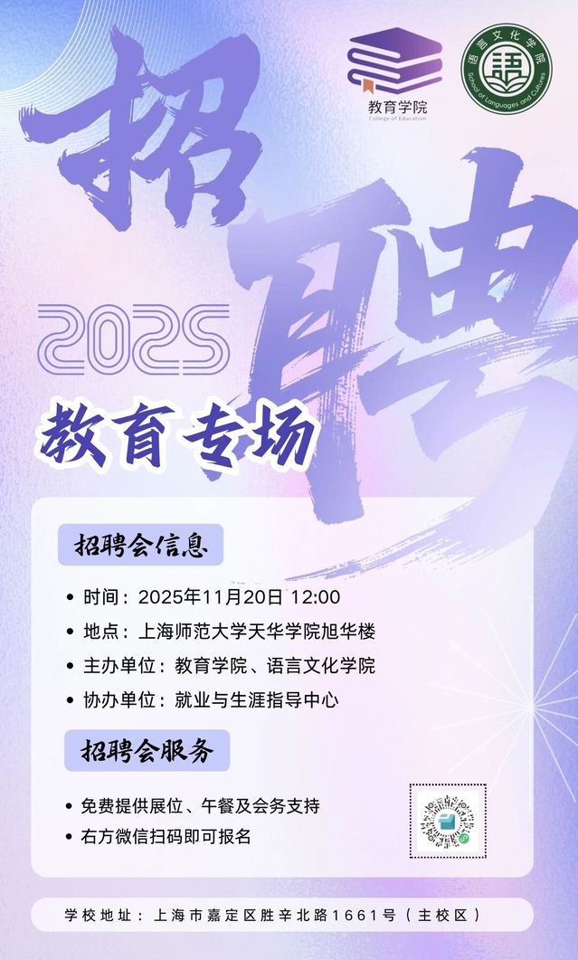 为助力教育行业人才生态建设,搭建校企协同育人优质平台,上海师范大学天华学院定于2025年11月20日(周四)12:00举办“聚力教育路、共筑人才梦”教育专场招聘会。我们诚挚邀请各优秀用人单位莅临参会,与我校学前教育、小学教育、艺术教育、英语、日语、汉语言文学等专业的优秀学子面对面交流,选拔心仪人才!