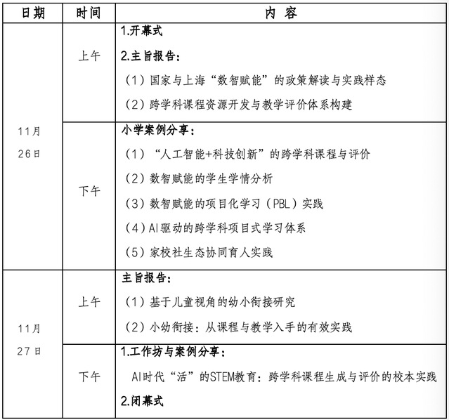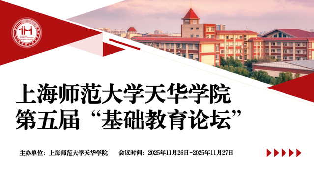 为深入贯彻《教育强国建设规划纲要(2024-2035 年)》 与 《上海市教育数字化转型 2.0 行动计划》要求,探索数智赋能下基础教育跨学科融合与小幼衔接的实践路径,上海师范大学天华学院拟于11月26日—27日举办第五届“基础教育论坛”,主题为 “数智赋能,学科共生:迈向科学衔接的基础教育新样态”。现将会议日程预通知如下:
