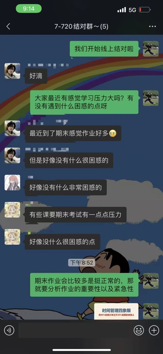 因见习周无法返校,本次结对我以线上方式与7-720寝室开展了交流。我询问同学们学业压力,是否遇到困惑的难题,以及外教授课是否适应。了解到他们都是上海的同学,每周都会回家,我提醒同学们往返途中要注意安全。得知同学们的作业量较大,我推荐他们运用“时间管理四象限”对作业进行分析,根据作业的紧急性进行先后排序。对于外教授课,他们表示有时会听不懂,我鼓励他们询问周围同学,或者课下与外教老师沟通。整个结对过程气氛融洽,交流顺畅,真正实现了双向赋能与共同成长。