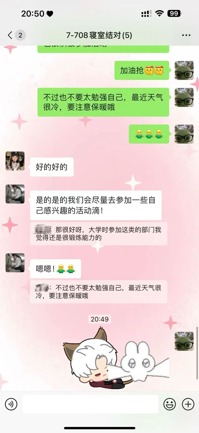 看到学妹们的感谢和对未来的规划,我感受到寝室结对的价值——也许不能一下子解决所有问题,但能让她们感受到温暖,知道前行路上有人同行。这次交流让我更坚定了责任,后续,我会继续帮助学妹们排忧解难。