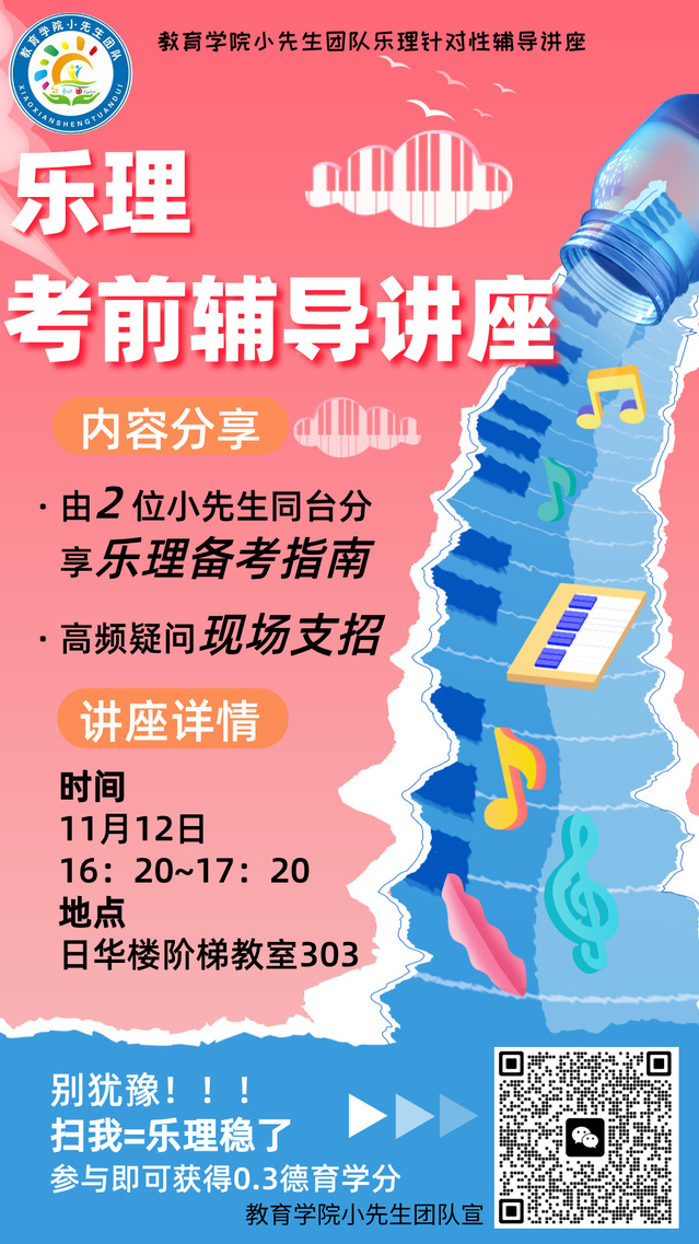 乐理考试将至,小先生团队特推出针对性辅导讲座,涵盖音的相关概念、记谱法、节拍与节奏三大板块,含定义、分类、记写及应用等核心乐理知识等,助大家从容应考,期待大家积极参与!