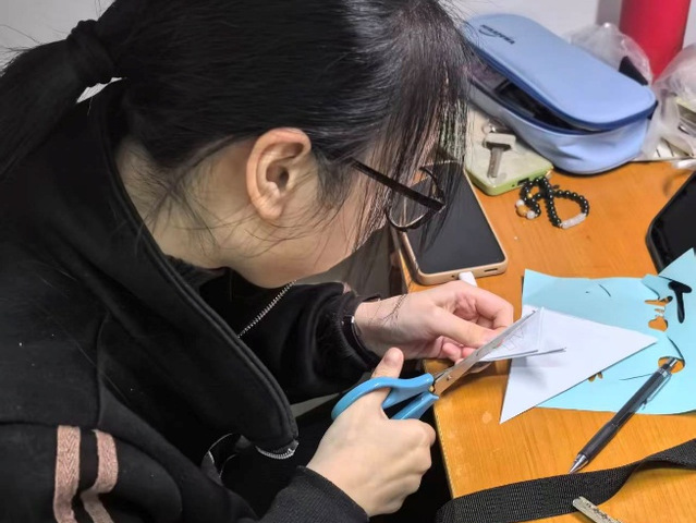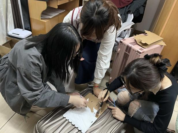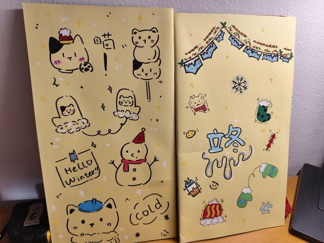 这是一个可爱的手工“冬日信箱”,整体以浅蓝和白色为主,屋顶装饰着雪花、猫咪等冬日元素。团队成员们围聚一处,以画笔为媒,精心描绘着信箱上的雪花与炉火。在创意的碰撞与无声的默契中,冬日的融融暖意于指尖悄然凝聚。这份共同的作品,让大家深深领悟了合作与创造带来的温度与力量。