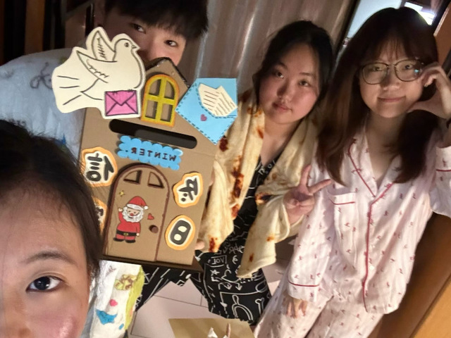 他们以纸箱剪出信箱主体,绘制了可爱的企鹅和北极熊形象并粘贴,再添加雪花装饰和“冬日信箱”字样。用彩笔和贴纸点缀,让整体更生动。通过这次合作,他们体会到团队分工的重要性,每个人的创意和努力让作品更完整。看到成品时,既成就感满满,也期待收到温暖的信件。
