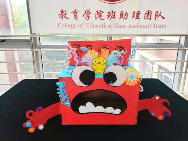 这个小组的冬日信箱是小怪兽造型,用了纸箱、彩绳、羽毛等拼贴。红色外表象征年兽,头顶扭扭棒化作烟花绽放,投信口是它的大嘴巴,正等接住冬日的温暖絮语。为校园寒冬里,增添一份年俗与善意交织的热乎气。