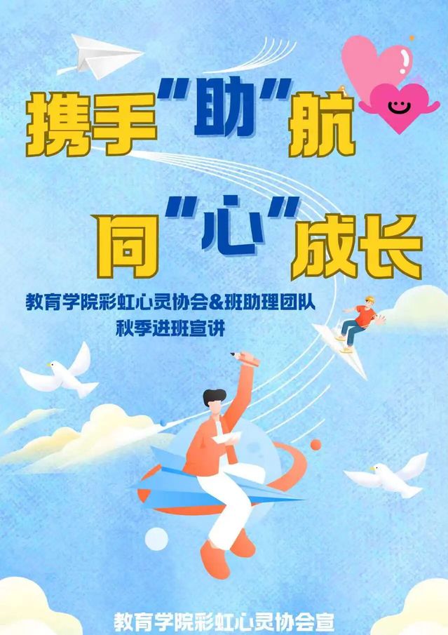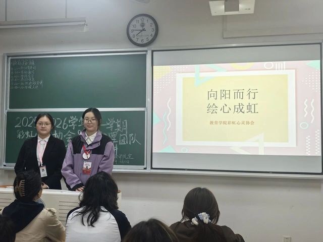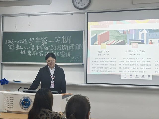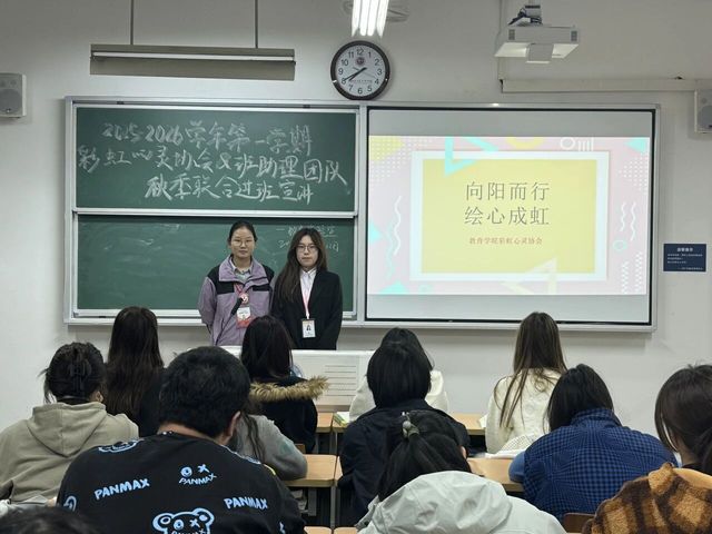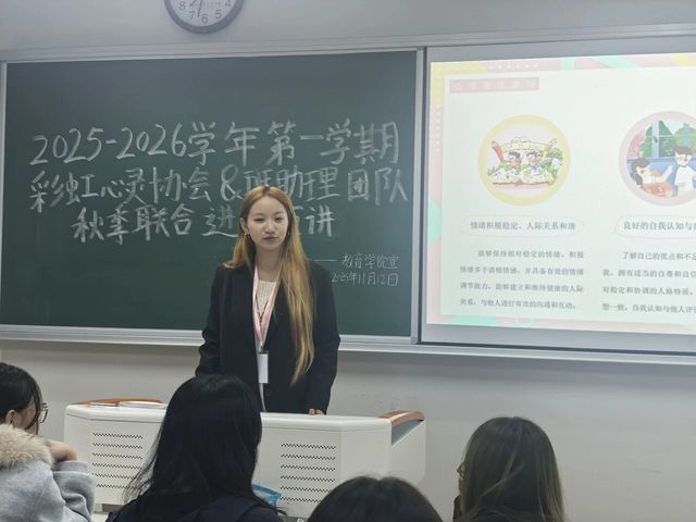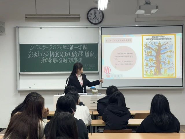 心理健康是守护心灵成长的坚实堤坝,求知修身是引领青春航程的明亮灯塔。为帮助同学们扣好大学的“第一粒纽扣”,教育学院彩虹心灵协会联合班助理团队举办了2025-2026学年第一学期秋季进班宣讲活动。本次活动旨在向新生普及心理健康知识,提升心理调适能力,并依托班助理在学业生活指导上的引路人角色,为同学们提供更加全面的成长支持。
