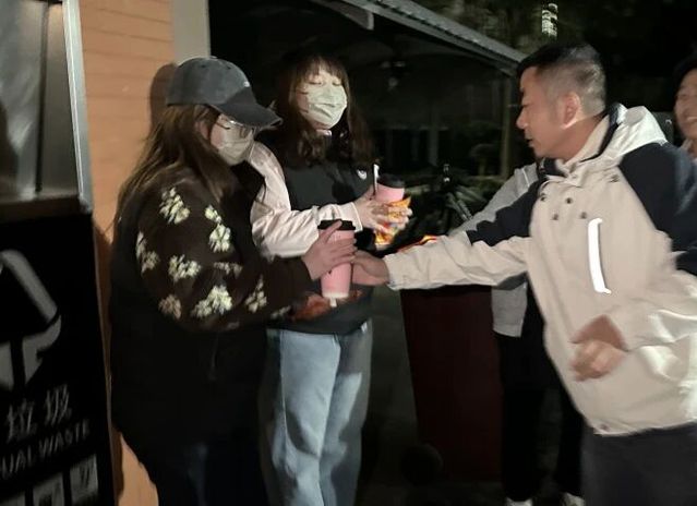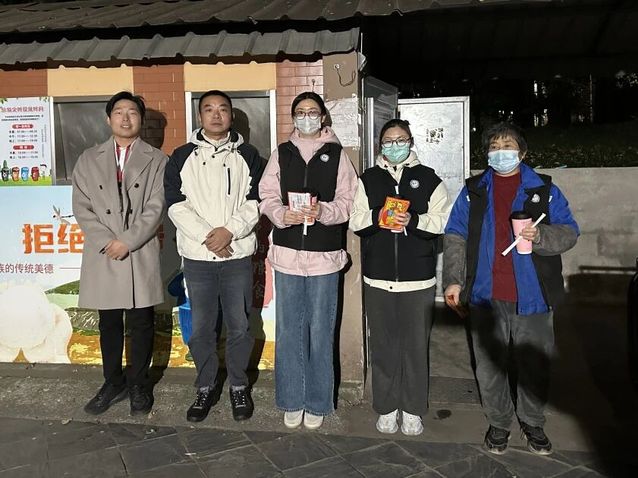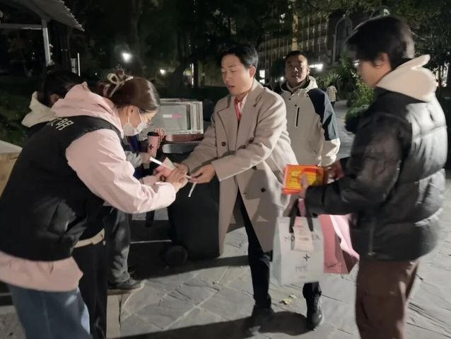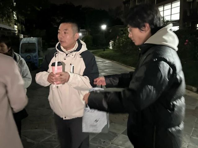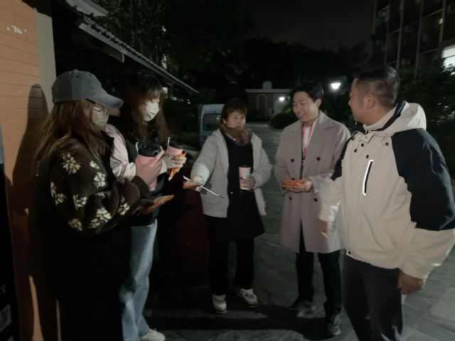 傍晚值班临近结束时,陈明晶老师与尤玉龙老师携温暖物资,前往7、8(9)号楼生态文明值班点走访。夜色已沉,寒意愈深,志愿者们仍坚守在垃圾房前,细致引导同学们做好垃圾分类。两位老师亲手为大家递上暖宝宝与热奶茶,亲切询问值班情况,对大家不畏严寒的奉献精神给予了高度赞许和深切关怀。