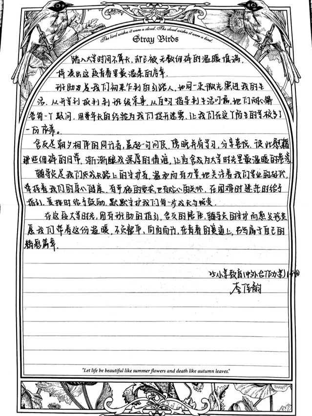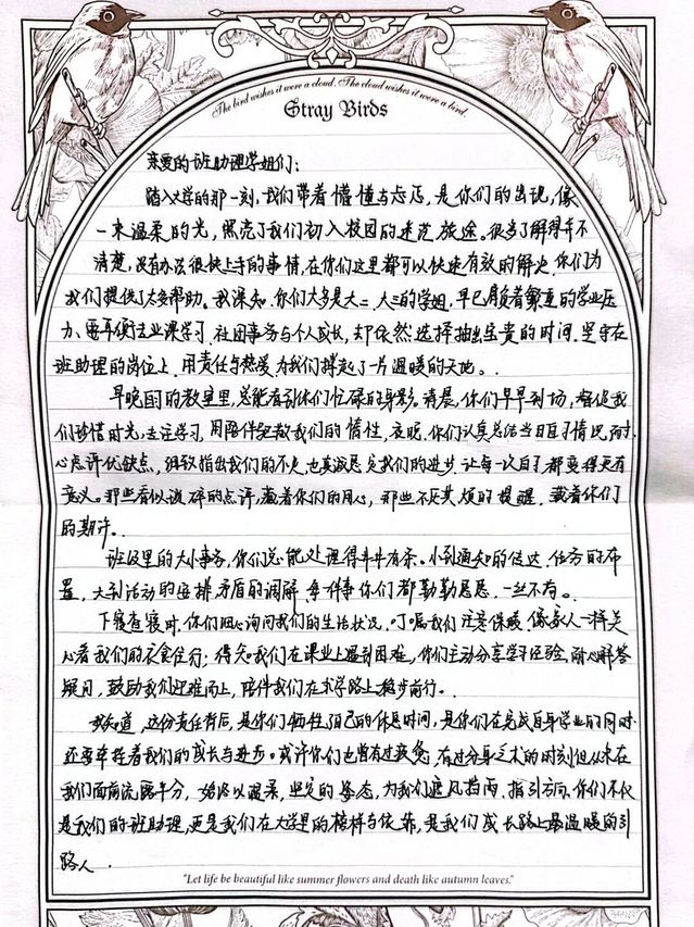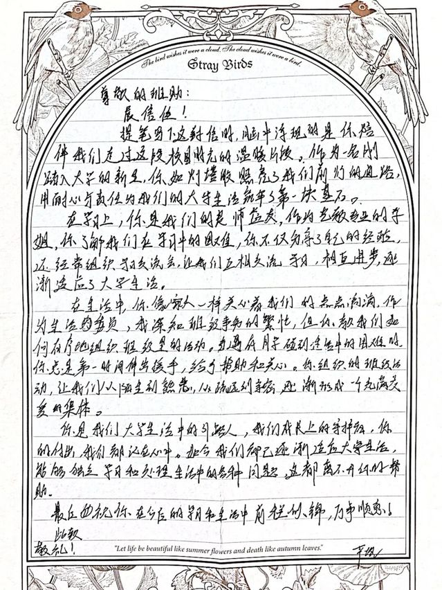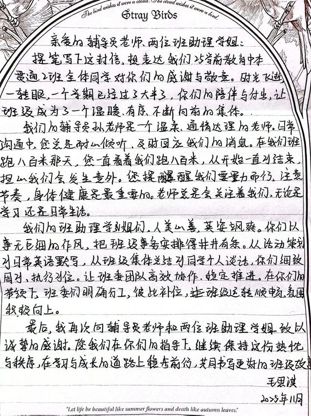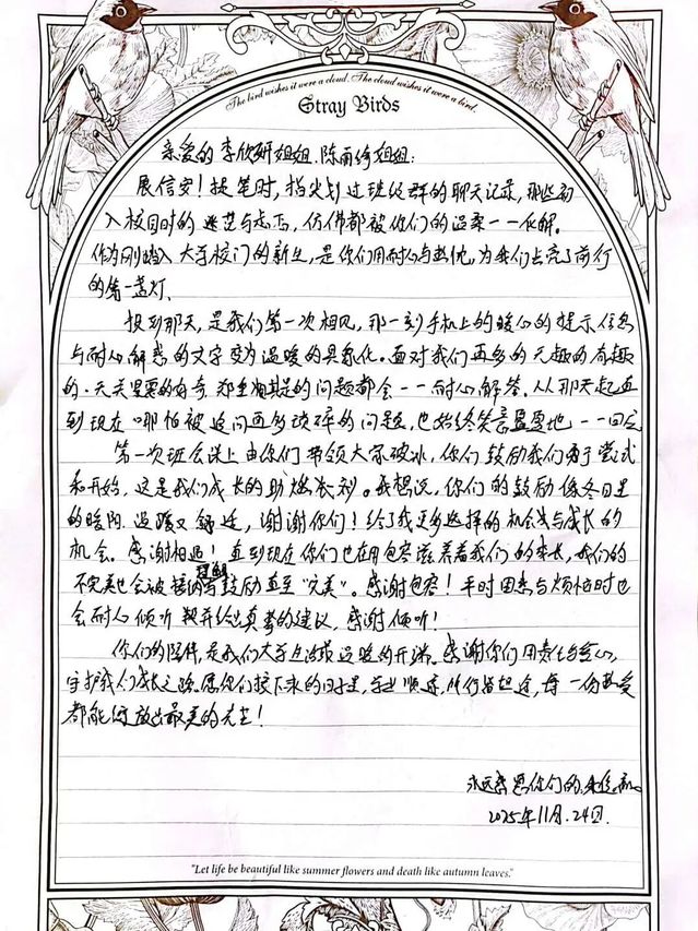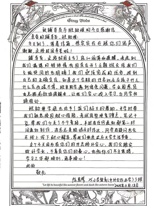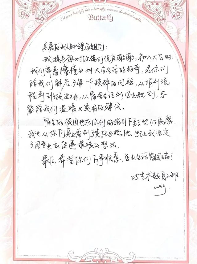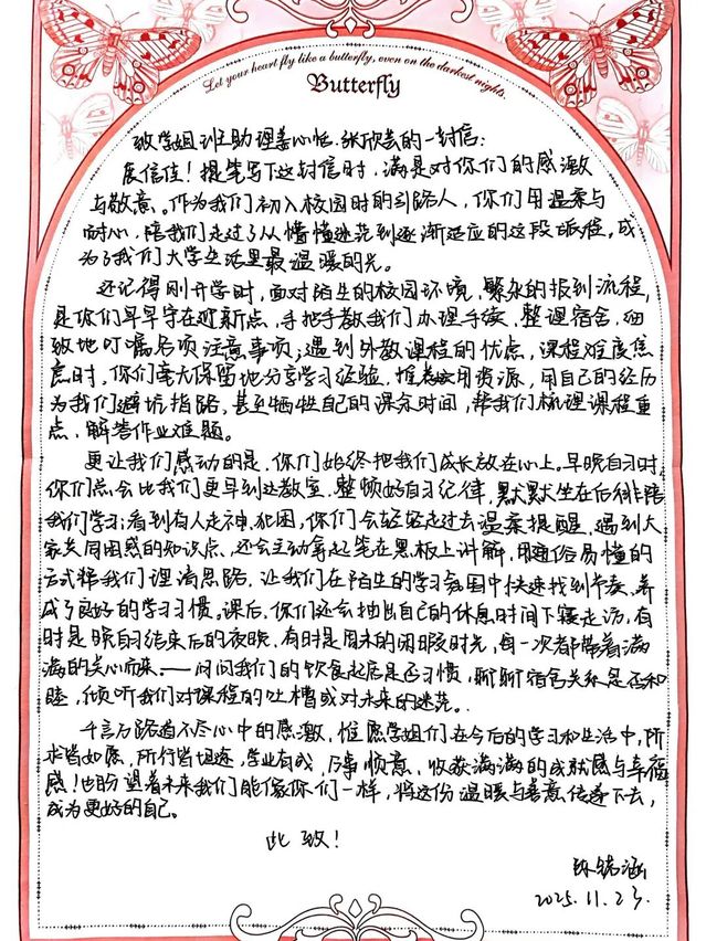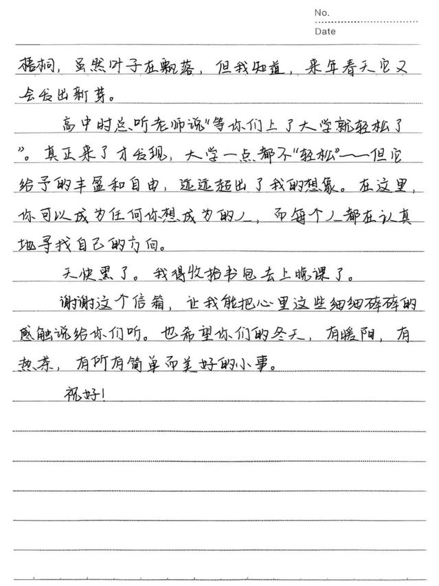 寒风虽至,温情常在。上一封班助理的“暖冬絮语”犹在耳畔,我们共同搭建的“冬日信箱”便收到了来自同学们最真诚、最热烈的回响。一字一句,是初入大学的憧憬与迷茫;一撇一捺,是对未来的期许与梦想。现在,就让我们一同启封,聆听这些藏在冬日里的心声,感受文字背后传递的温暖与力量。