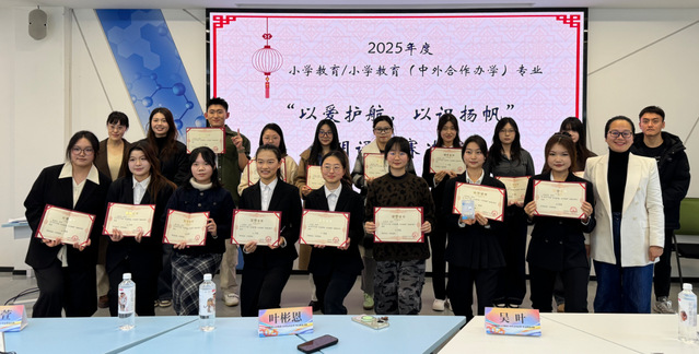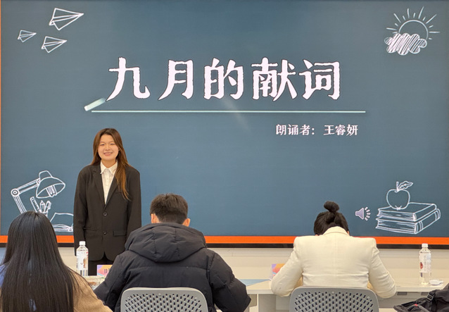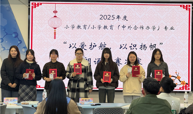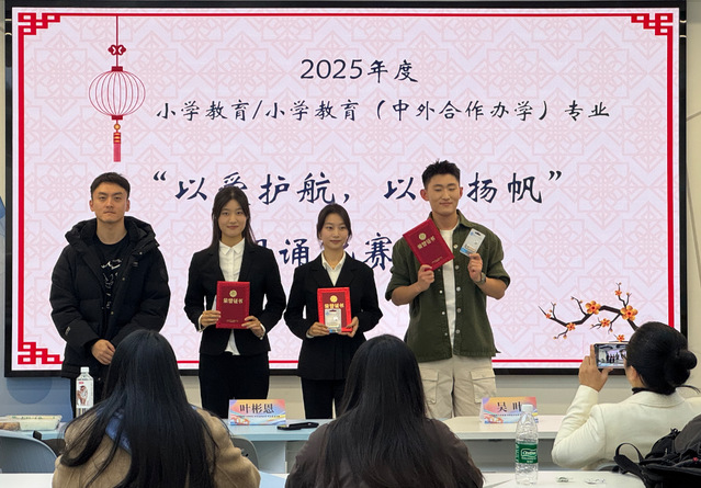 朗诵能力是师范生应具备的专业实践能力之一,为了更好地促进我校小学教育专业学生自觉提高语言运用与表达能力,夯实普通话基本功,提升语言感染力,并为学生提供锻炼、展示的平台,引导其自觉加强师范生基本技能训练,教育学院小学教育、小学教育(中外合作办学)专业于2025年11月19日中午11:30-12:50在旭华楼智慧教室211开展了此次“以爱护航,以识扬帆”的师范主题朗诵比赛。莅临本次决赛的评委老师有:小学教育专业主任叶彬恩,专业教研组长、上海市普通话水平测试员吴叶,小学教育专业教师程文萱。通过前一阶段初赛的比拼与优中选精式的选拔,15位选手脱颖而出,突出重围进入决赛。比赛现场十分精彩,激扬文字的舞台上,选手以昂扬饱满的精神气质、铿锵标准的语言表达、声情并茂的情感抒发,深深地打动了评委老师与现场观众。