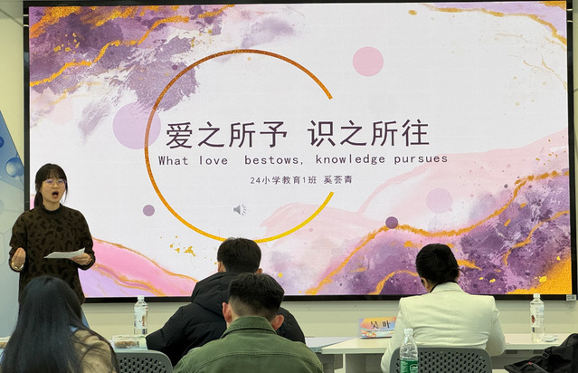 小学教育3班的严锦同学用温和清亮的嗓音、沉着铿锵的语调让我们再一次确认了“真正的教育,是让爱里有光,让学识中有温度”。同时,更倾吐了她“愿用爱的光芒,照亮前路,为孩童驱散迷茫;愿以识的力量,鼓满风帆,送少年远航”的挚切心愿。