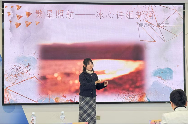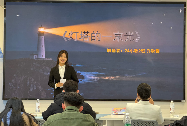 24小学教育1班的黄子琛同学首先带来冰心诗组新诵《繁星照航》,她将教师比作吹绿少年心田中寸寸新苗的人间春风,饱含深情地表达了对老师的敬爱,以及期望自己也成长为照临下一代青年成长之路的人民教师的殷切心情。