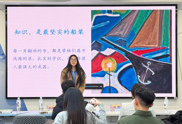 我们怀着安静而深厚的爱作为不变的航标,又将运用广博而明晰的学识作为不懈前进的动力。小学教育1班的奚荟青同学充满温情而有张力的朗诵,流淌出心中“爱”与“识”的教育交响:“温暖的记忆成了最稳定的压舱石,让我们在起伏漂泊中始终能稳住船身;由学识与思考铸就的骨架,则支撑着我们,在颠簸与修正中将船体锤炼得愈发坚韧、成熟。”
