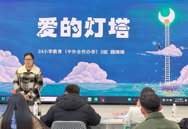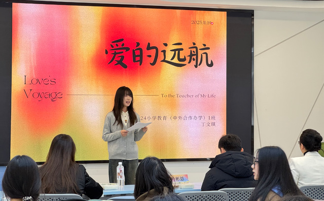 “当温暖的师爱与明亮的学识交融,教育便成为这世间最美的风景。”小学教育(中外合作办学)3班顾绮绮同学深情而细腻地朗诵了《爱的灯塔》,表达了她“愿为渡口的摆渡人,让每一颗幼小的心灵都被温柔安放,让每一个梦想都敢乘风破浪”的真挚心愿。