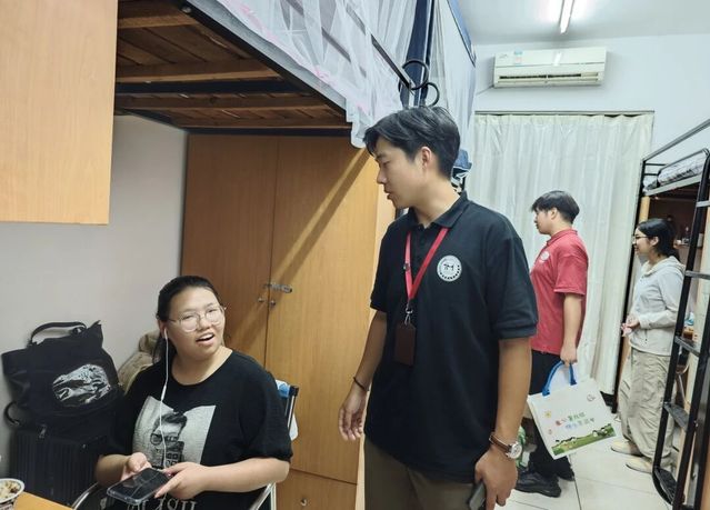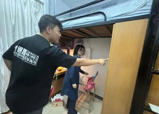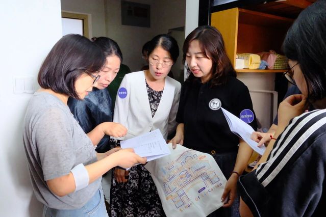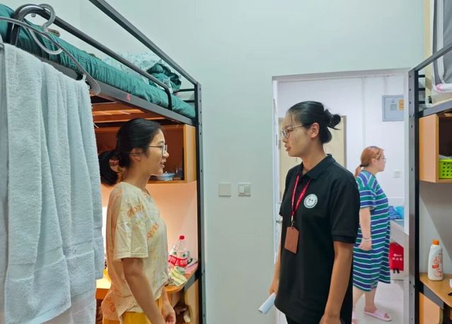 上午10:30,教育学院院长徐娟、副院长韩苏曼、党总支书记沈思、副书记陈浩一同前往新生宿舍楼,他们带着对新生们的关切与期待,逐一走进各个寝室。