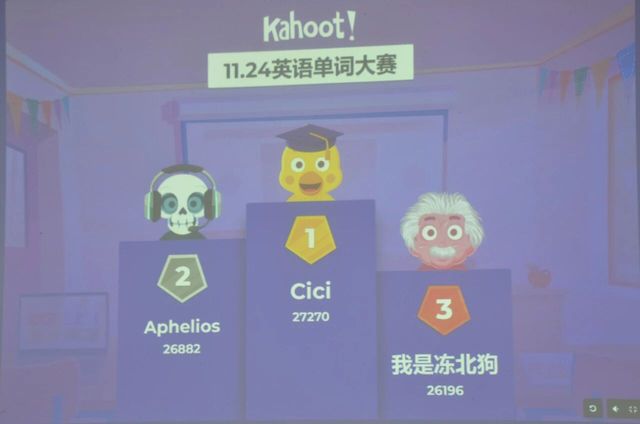 本次竞赛设置四大特色环节,全方位检验学子词汇能力:听力板块聚焦“听英文写单词”,考验听觉敏感度与拼写准确性;词性板块以“看英文写词性”为核心,夯实语法基础;释义板块通过“看英文写释义”比拼,深化词汇理解;而“KAHOOT”互动游戏环节,则以实时排名、趣味音效的游戏化形式考查英语综合应用能力,让学习像玩游戏一样有趣。