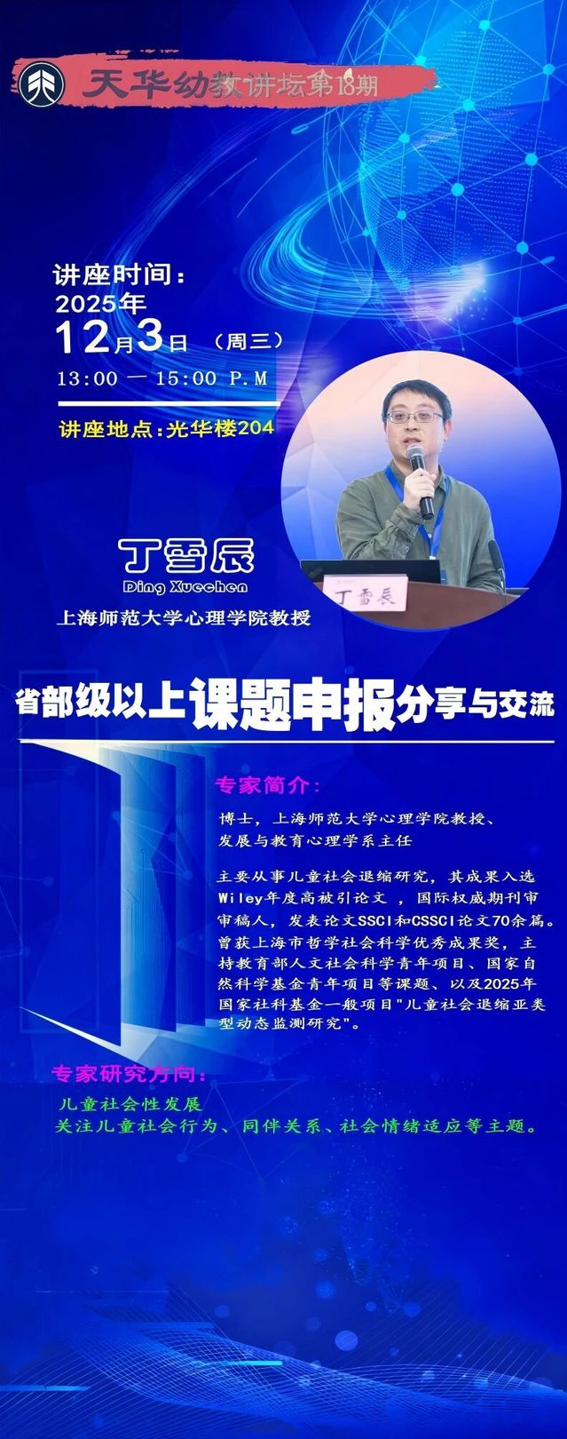 2025年12月3日下午,为进一步提升教育学院教师的科研能力与课题申报水平,教育学院特邀上海师范大学心理学院教授、发展与教育心理学系主任丁雪辰来院开展“省部级课题申报经验分享与交流”专题讲座。活动在光华楼204举行,由教育学院副院长张萌主持,学院多位教师积极参加,现场气氛热烈。