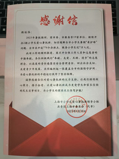 这个暑假,我在徐汇区漕河泾街道做了为期六周的爱心志愿服务,度过了一段充实而有意义的时光。我的主要工作是担任临时辅导员,这段经历让我学会了如何用爱心与责任去温暖社会也锻炼了我的组织和沟通能力。