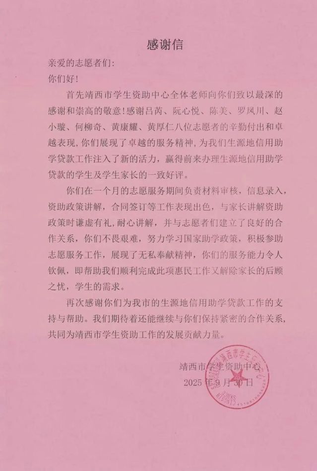 暑假期间在靖西资助中心任志愿者,协助工作人员办理助学贷款,负责资料核对、流程指引及信息登记,耐心解答学生及家长疑问,保障贷款办理高效有序,助力学子顺利申请助学资金。