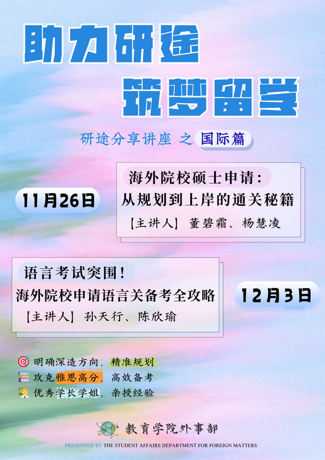 近期,教育学院外事部组织的两场干货满满的留学主题分享讲座相继开展,22级的学长学姐们倾情分享申请经验与备考技巧,为有志于海外求学的同学们答疑解惑、赋能助力。