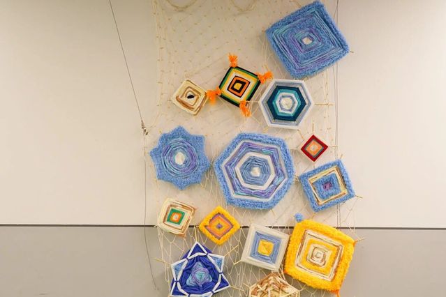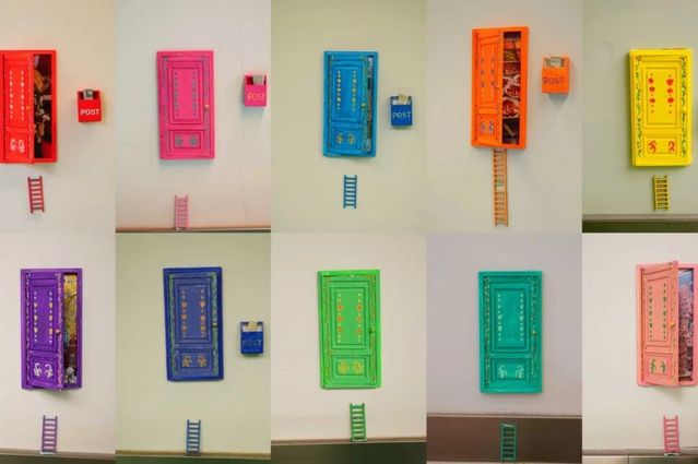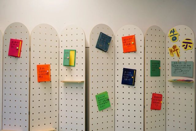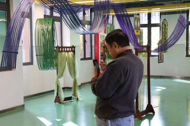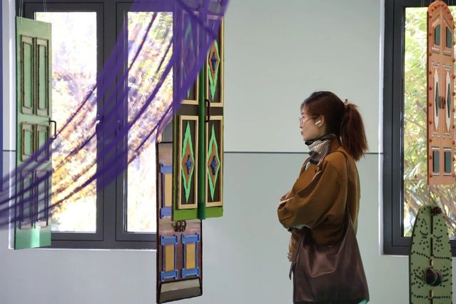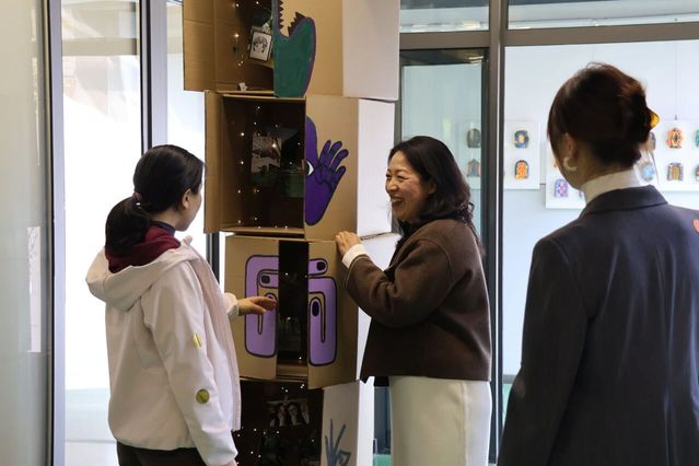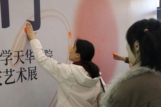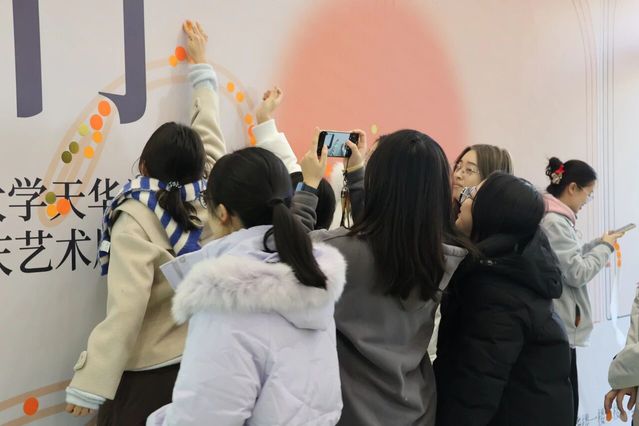 展厅内,“门”主题装置错落陈列。同学们的作品吸纳多元经验、融入独特巧思,件件独具匠心。展区既有恢宏大型装置震撼人心,更藏诸多精巧细节——或隐于走廊墙角,或嵌于展区不起眼处,静待参观者慧眼探寻。展区内参观者络绎不绝,现场氛围热烈而浓厚。大家或驻足凝视,沉醉于作品的匠心细节;或细品融合光影技术的特色佳作,亲身感受传统技艺与现代创新的精彩碰撞;或畅谈观展感悟,深入探讨艺术创作与美育教学的深层联结;互动装置区更是人气高涨,参观者纷纷拿起便利贴写下心得并张贴于展示墙,以沉浸式参与感为展览增添了别样活力。
