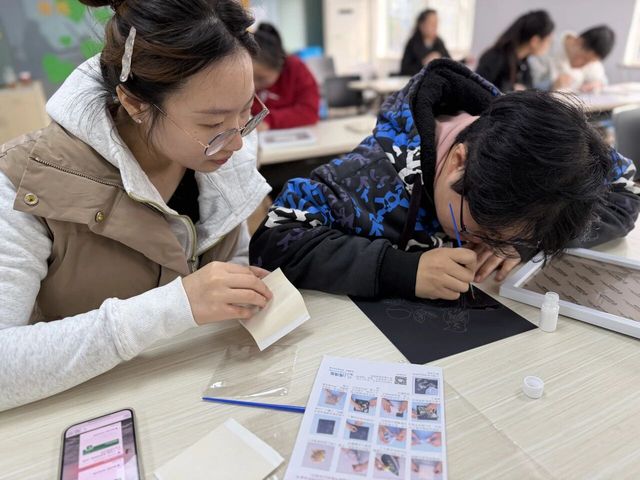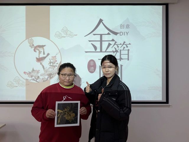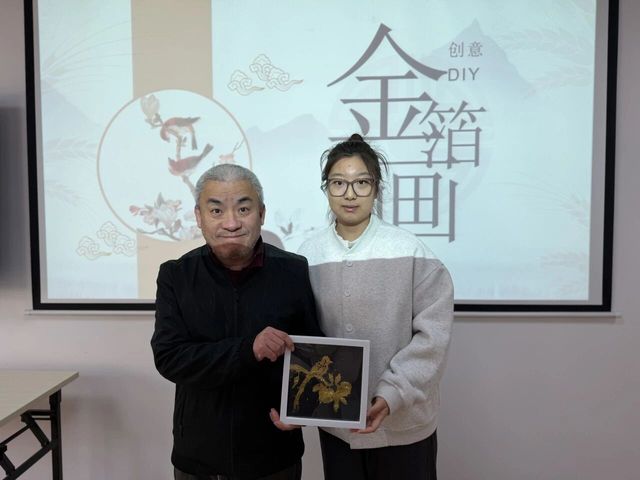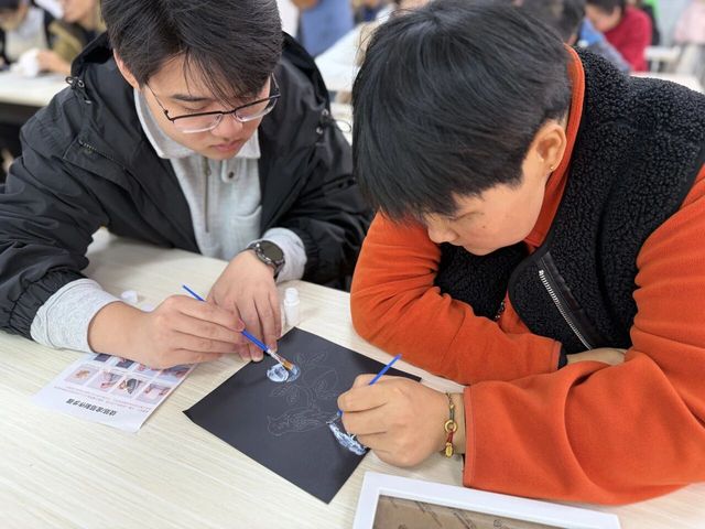 第二环节为DIY非遗金箔画制作活动。在讲解结束后,志愿者们一对一协助学员进行DIY非遗金箔画的制作。在DIY环节,学员们展现出了浓厚的兴趣和惊人的创造力。在志愿者的协助下,他们将一片片薄如蝉翼、闪耀着光芒的金箔黏贴在画稿上,勾勒、刷胶、贴箔、按压,每一步都全神贯注,一丝不苟。现场气氛欢乐而专注,欢声笑语不断。