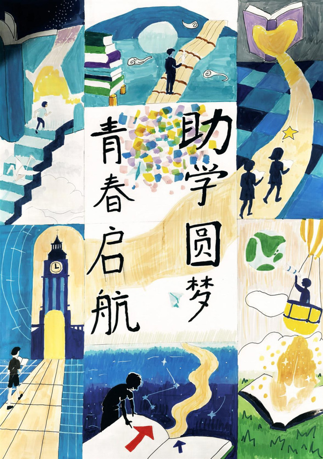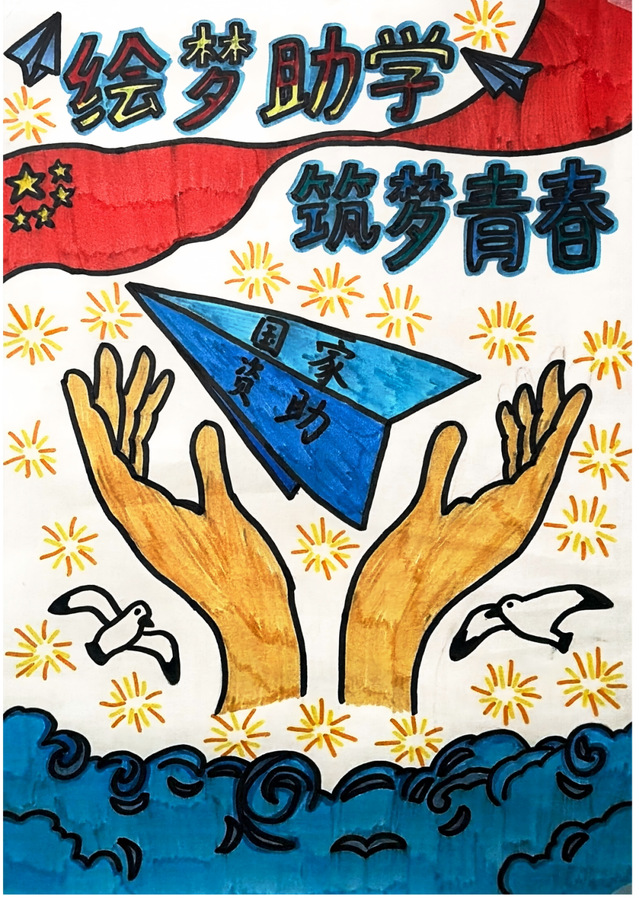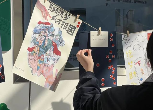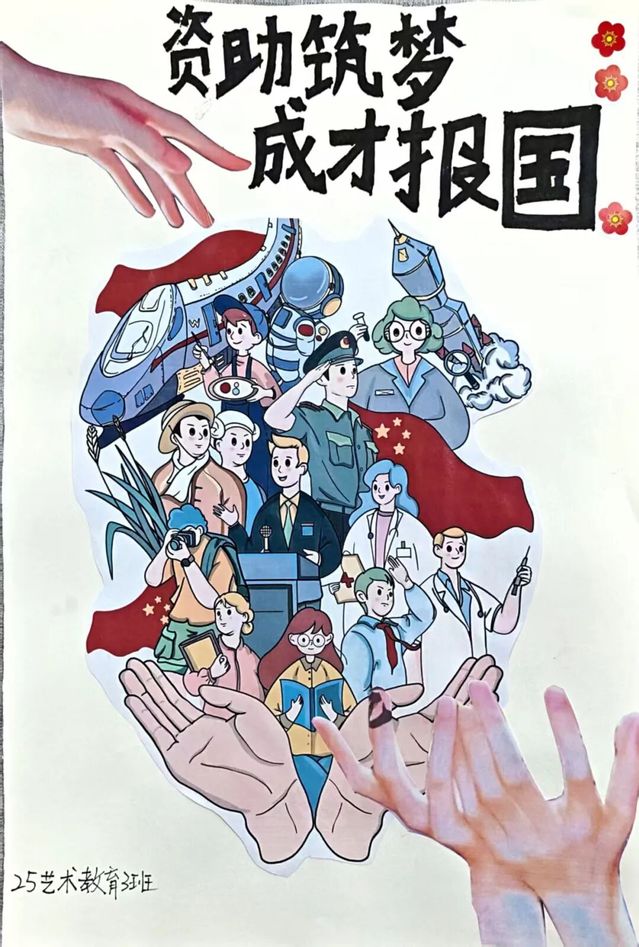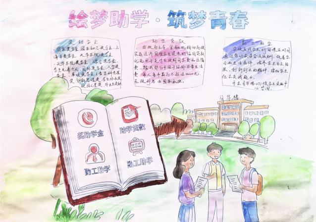 政策解读类作品以清晰图文拆解奖助政策要点,让助学贷款、勤工助学等信息一目了然;励志感恩类作品用温暖笔触勾勒受助学子的奋斗轨迹,字里行间满是对国家与学校的真挚谢意;退役士兵主题作品展现了身份转变后的励志成长,诚信教育类作品则以鲜明导向传递诚信申请的理念。每一幅原创海报都凝聚着创作者的巧思,从色彩搭配到立意表达,既具艺术美感,又富含教育意义,用心诠释了活动主题。