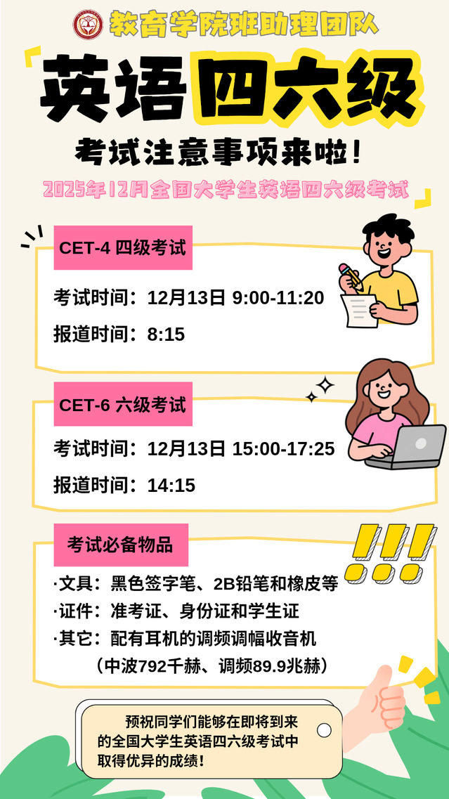 2025年下半年全国大学英语四六级考试将于12月13日举行。为帮助各位考生顺利参加考试,现温馨提示如下 ——
