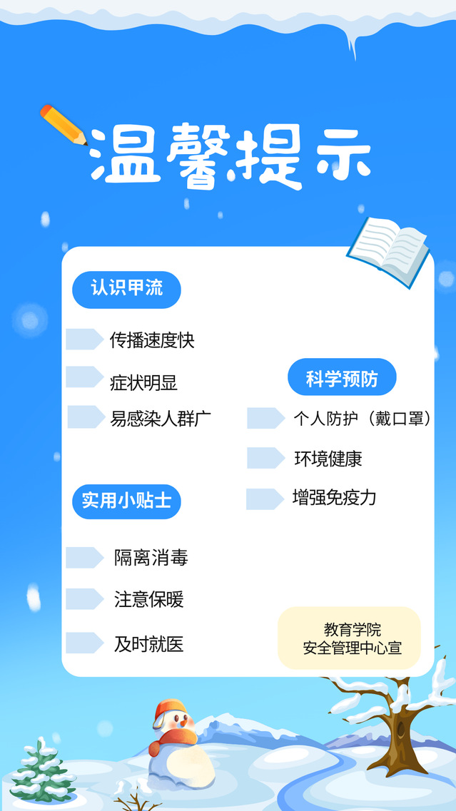 随着气温骤降,冬季成为传染病的高发期,其中流行性病毒引发的疾病尤为常见,甲流便是典型代表。教育学院安全管理中心温馨提示:做好科学预防,才能为健康筑起“防护墙”。