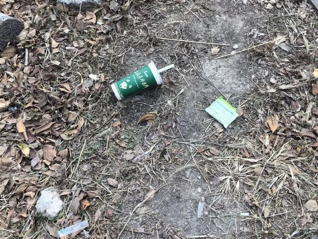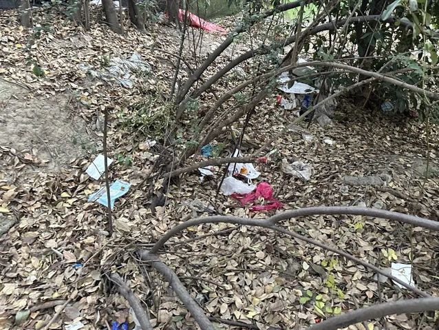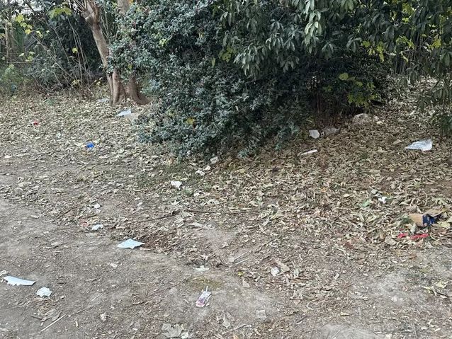 学期临近尾声,学校北门外绿化带多处堆积大量垃圾,影响环境整洁。
