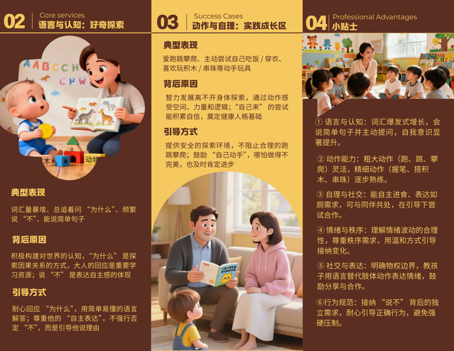初见托班的孩子们,我直观感受到了幼儿之间显著的个体发展差异。例如语言表达上,有的孩子词汇积累丰富、口齿清晰,能像手册中描述的那样好奇心驱动提问、用短句表达想法;有的孩子则因表达能力尚在发展阶段,难以清晰表述,需要老师平日里耐心倾听与引导。随后,带班老师结合手册里“典型表现”“引导方式”等内容给予我们专业的指导,让我们意识到手册中部分关于特殊行为、针对性引导的内容,更适用于特殊幼儿发展需求,并非贴合所有托班幼儿的普遍发展特点。