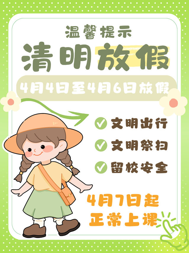 清明节是缅怀先人、寄托哀思的传统节日。倡导大家采用网络祭扫、鲜花追思等文明环保的方式表达追思之情,自觉摒弃焚烧纸钱等行为,共同守护绿色整洁的环境,传承文明祭扫新风尚。
