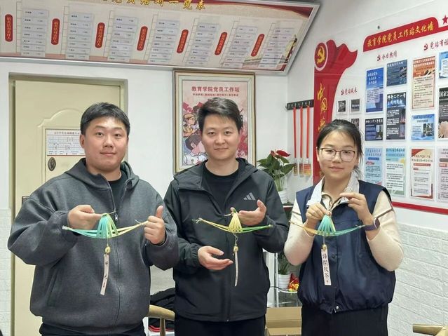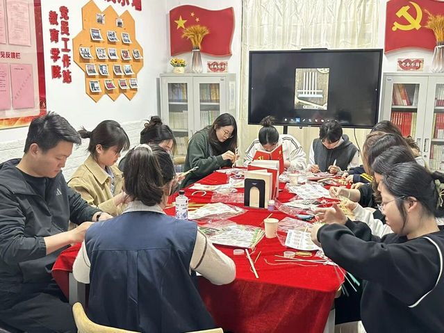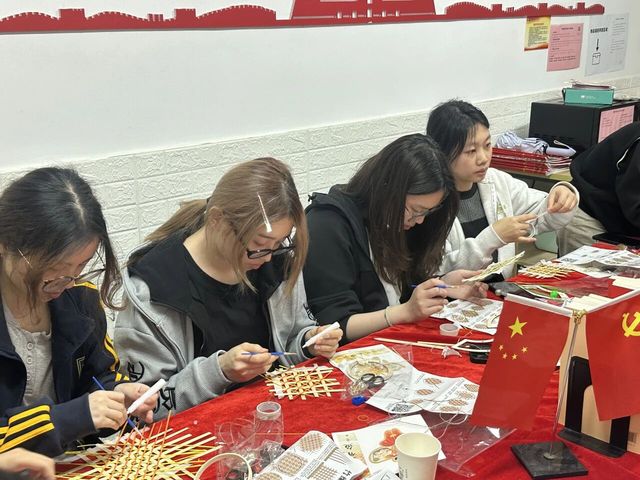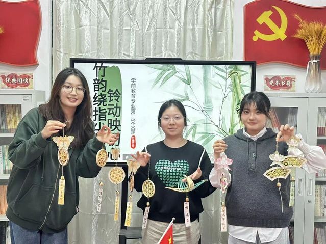 制作过程中,老师们穿梭于各位同学耐心指导编织细节,与同学们交流创意与心得。大家也彼此互帮互助,分享编织技巧,现场欢声笑语不断。从竹条交错编织到铃铛系挂完成,每一枚竹铃的完成都凝聚着专注的心力与协作的温情。在轻松融洽的氛围里,在指尖起落间,师生之间的距离悄然拉近,支部的凝聚力也在无声中加深,充分展现出支部团结向上、互助共进的组织活力。