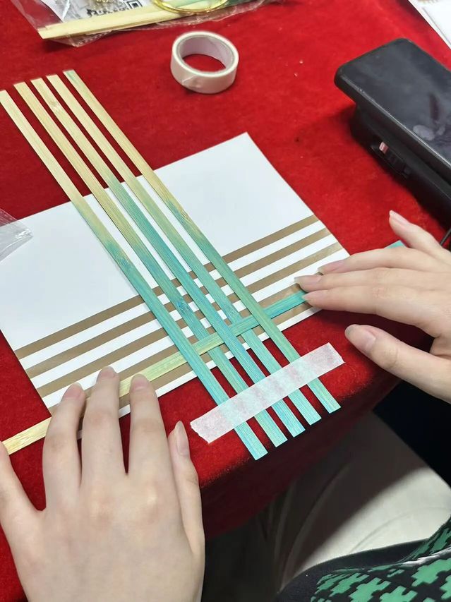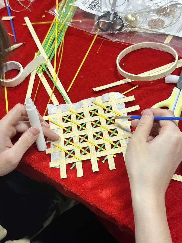 活动伊始,大家共同学习非遗竹编的历史渊源与基本技法,认真观摩基础编织技法教学视频,从起底、压挑到收口逐步领会要领,接着老师们也与同学们一起动手尝试,指尖翻飞、耐心编织,原本零散的竹条逐渐成型,一枚枚竹铃初具雏形。