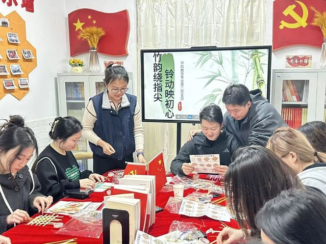 为弘扬中华优秀传统文化,丰富支部组织生活,增进师生情感联结,学前教育专业第二党支部于2026年4月8日下午16时,在6号楼党员工作站举办“竹韵绕指尖,铃动映初心”竹编风铃非遗主题活动。学前教育专业第二党支部的老师们与同学们齐聚一堂,以竹为媒、以编传情,在经纬交织的竹编技艺中,沉浸式体验非遗的魅力,共赴一场指尖上的文化之旅。