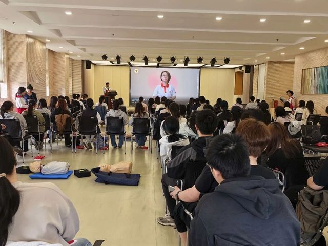 培训现场,专业应急救护讲师围绕急救关键要点进行细致讲解,结合视频案例深入剖析心肺复苏“黄金4分钟”处置原则、AED规范使用流程及海姆立克急救法操作要领,使抽象知识直观易懂,帮助学生筑牢理论基础。